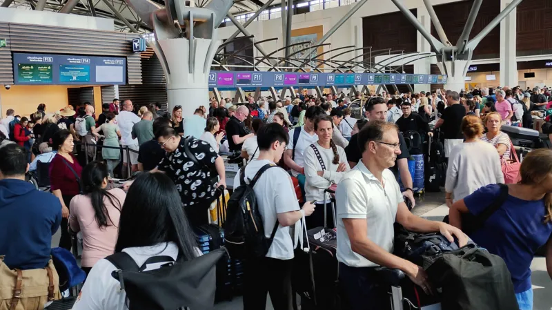 | Passengers queue at Muscat airport on Thursday after Qatar Airways said they would begin operation a limited number of relief flights for some places in Middle East(Image: Rajen Shah) |